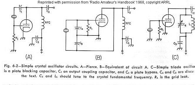 The simplest crystal-oscillator circuit is shown in Fig. 6-2A. An equivalent circuit is shown in Fig. 6-2B., where C4 represents the grid -cathode capacitance and C5 indicates the plate-cathode, or output capacitance. The ratio of these capacitors controls the excitation for the oscillator, and good practice generally requires that both of these capacitances be augmented by external capacitors, to provide better control of the excitation.