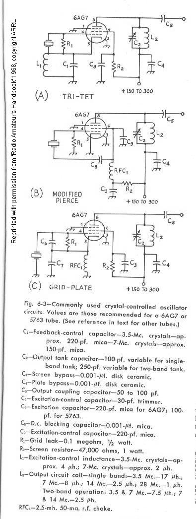 In these circuits, output may be obtained at multiples of the crystal frequency by tuning the plate tank circuit to the desired harmonic, the output dropping off, of course, at the higher harmonics. Especially for harmonic operation, a low-C plate tank circuit is desirable.For best performance with 6AG7 or 5763, the values given under Fig. 6-3 should be followed closely.