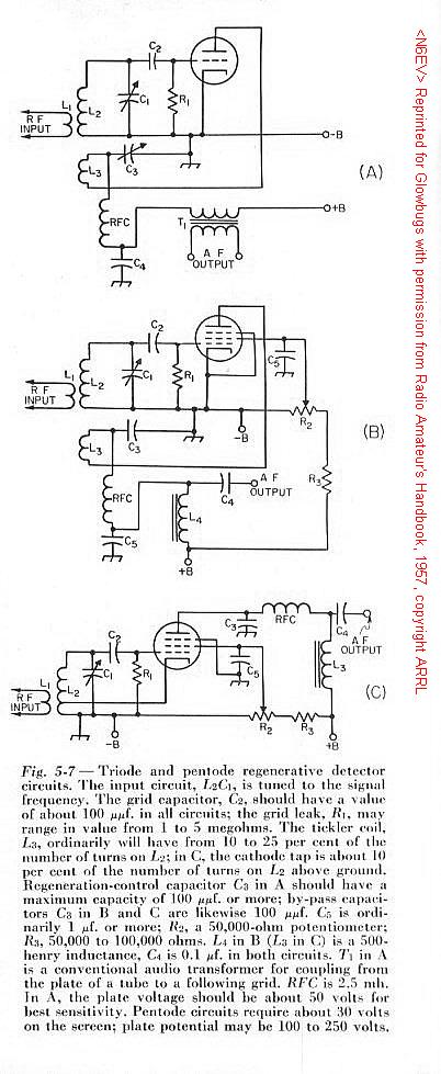 The circuit of Fig. 5-7A uses a variable bypass capacitor, C4, in the plate circuit to control regeneration. When the capacity is small the tube does not regenerate, but as it increases toward maximum its reactance becomes smaller until there is sufficient feedback to cause oscillation. If L2 and L3 are wound end-to-end in the same direction, the plate connection is to the outside of the plate or "tickler" coil, L3, when grid connection is to the outside of L2.